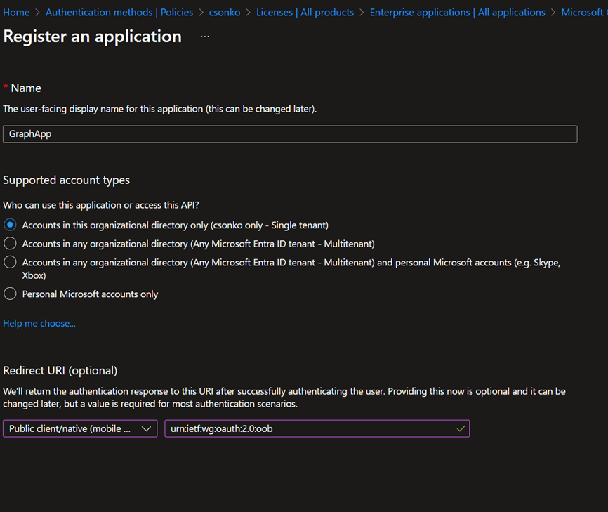 To follow these recommendations, I created an Enterprise application in my tenant, gave it a random name, and a redirect URI of type Public client/native with the value urn:ietf:wg:oauth:2.0:oob